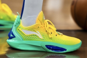 入場時庫里穿的是韋伯CDubbz 球鞋,到了熱身階段庫里換了一雙鞋,是隊友巴特勒的簽名鞋——李寧 JB3 巴西配色。