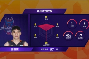 ??1月9日,常規(guī)賽第12輪,山東高速客場87-85戰(zhàn)勝北京北汽,收獲5連勝。本場比賽山東高速隊高詩巖因傷缺陣,后衛(wèi)線上珀賽爾和謝智杰站了出來,珀賽爾在最后時刻完成絕殺,謝智杰登場29分11秒,貢獻15分7籃板6助攻。這是謝智杰職業(yè)生涯首次打出15+5+5的表現(xiàn)。