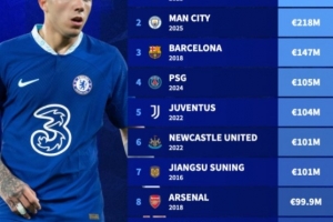 以下為足壇俱樂部單個冬窗引援花費(fèi)排行榜: