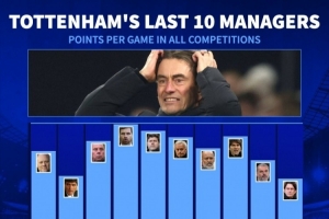 據德國轉會市場統(tǒng)計,弗蘭克執(zhí)教熱刺各賽事場均僅拿到1.32分,近10任熱刺主帥場均積分最少。