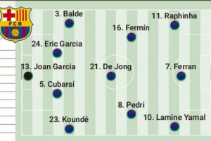 體育資訊1月11日訊 北京時(shí)間明天凌晨,巴薩將在西超杯決賽中對陣皇馬,《阿斯報(bào)》預(yù)測了巴薩此役的首發(fā)陣容。