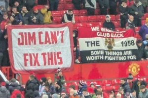 現(xiàn)場(chǎng)的曼聯(lián)球迷打出了兩面橫幅,其一是“吉米(拉特克利夫的名字)解決不了這個(gè)”,另一面橫幅則寫著“我們想要回我們的俱樂部。1958。有些事是值得為之奮戰(zhàn)的?!?/p>
