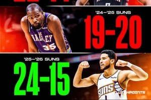 太陽本賽季前39場,戰(zhàn)績24勝15負,暫時排名西部第6。上賽季同期,他們戰(zhàn)績是19勝20負。