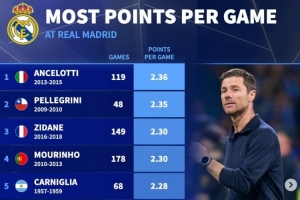體育資訊1月13日訊 皇馬已經(jīng)官宣解雇哈維·阿隆索,《轉(zhuǎn)會市場》統(tǒng)計顯示后者位列皇馬隊史拿分榜第7位。