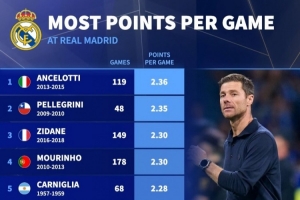體育資訊1月13日訊 皇馬官方宣布主帥阿隆索下課,德國轉(zhuǎn)會市場統(tǒng)計了皇馬主帥的場均積分,阿隆索2.24分排名第7位。