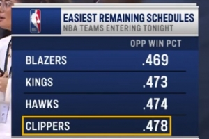 快船主場(chǎng)迎戰(zhàn)黃蜂,轉(zhuǎn)播方給出一項(xiàng)統(tǒng)計(jì),剩余對(duì)手勝率排名,快船第四輕松。