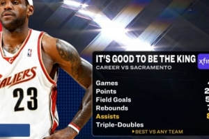 其中,場(chǎng)均8.5次助攻是詹姆斯對(duì)陣所有球隊(duì)中最高的。