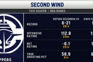 快船主場迎戰(zhàn)黃蜂,轉(zhuǎn)播方對比了快船前27場和近11場各項(xiàng)數(shù)據(jù)對比。