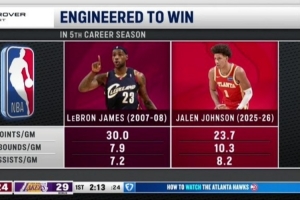 老鷹客場(chǎng)挑戰(zhàn)湖人,轉(zhuǎn)播方曬出杰倫·約翰遜和詹姆斯生涯第五個(gè)賽季的數(shù)據(jù)對(duì)比,老鷹官推轉(zhuǎn)發(fā)。