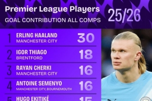 體育資訊1月14日訊 Squawka統(tǒng)計了本賽季英超球員各賽事的參與進球數量,并列出榜單,哈蘭德參與30球斷層居首。