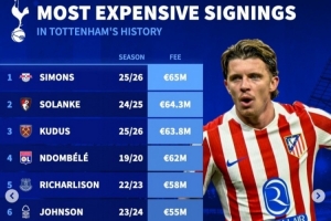 體育資訊1月15日訊 熱刺已經(jīng)官宣簽下馬競中場加拉格爾,《轉(zhuǎn)會(huì)市場》也統(tǒng)計(jì)了熱刺隊(duì)史引援榜情況,哈維·西蒙斯等4將超過6000萬歐元。