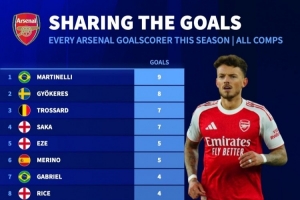 阿森納本賽季16人取得進(jìn)球: