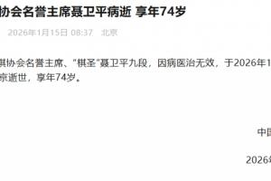 中國圍棋協(xié)會(huì)名譽(yù)主席、“棋圣”聶衛(wèi)平九段,因病醫(yī)治無效,于2026年1月14日22時(shí)55分在北京逝世,享年74歲。