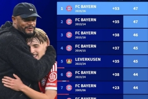 凈勝球+53積分47,孔帕尼帶拜仁創(chuàng)造德甲歷史最佳半程成績
