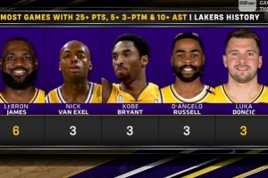 湖人隊(duì)史單場至少25分10助&命中3記三分場次:詹姆斯6次最高;東契奇,拉塞爾,科比,范??巳麪柦?次