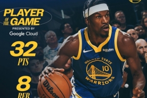 賽后,勇士官方發(fā)布本場最佳數(shù)據(jù)海報:吉米·巴特勒當選。