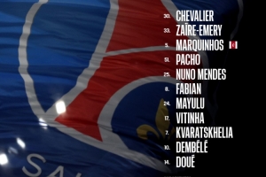30-舍瓦利耶、33-扎伊爾·埃梅里、5-馬爾基尼奧斯、51-帕喬、25-努諾·門德斯、8-法比安·魯伊斯、24-馬尤盧、17-維蒂尼亞、7-克瓦拉茨赫利亞、10-登貝萊、14-杜埃