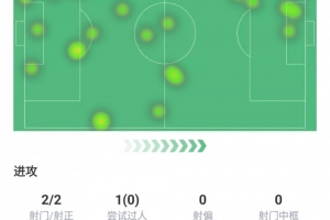 觸球43次、傳球29次、關(guān)鍵傳球1次、傳球成功率79.3%、傳中1次、長傳1次成功率100%