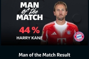 凱恩在本場比賽打進(jìn)1球,獲得了44%的得票率。值得一提的是,替補(bǔ)獨造4球的奧利塞并未進(jìn)入候選名單。