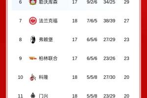 體育資訊01月18日訊 今日德甲第18輪,拜仁客場(chǎng)5-1萊比錫,最新積分榜如下: