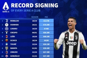 體育資訊7月18日訊 德轉(zhuǎn)列意甲各隊(duì)標(biāo)王,尤文1.17億歐簽C羅第一,奧斯梅恩7890萬(wàn)歐加盟那不勒斯第二,盧卡庫(kù)第三。