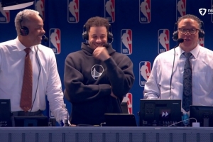 勇士主場迎戰(zhàn)黃蜂,比賽中勇士球員賽斯·庫里加入他的父親、黃蜂解說員戴爾·庫里,一起解說這場比賽,斯蒂芬·庫里則正在場上比賽。