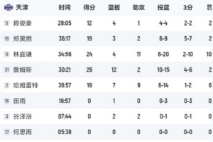 此役,天津主力發(fā)揮出色全部得分上雙,合計(jì)砍下100分,反觀替補(bǔ)5人登場(chǎng)合計(jì)僅得2分。