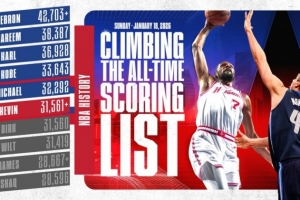 比賽第四節(jié)最后時(shí)刻,杜蘭特走上罰球線兩罰全中拿到本場比賽第18分,生涯總得分來到31562分,正式超越諾維茨基(31560分),榮升NBA歷史得分榜第六!