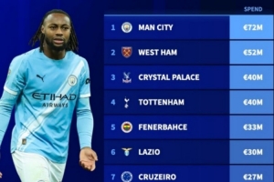體育資訊1月19日訊 德轉(zhuǎn)盤(pán)點(diǎn)了冬窗至今花費(fèi)榜單,其中曼城居首,具體如下: