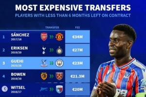 體育資訊1月20日訊 曼城已經(jīng)官宣引進(jìn)水晶宮中衛(wèi)格伊,《轉(zhuǎn)會(huì)市場》統(tǒng)計(jì)顯示他也是合同僅剩不到半年情況下的歷史第3貴球員。