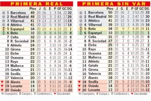 體育資訊1月20日訊 《阿斯報》統(tǒng)計了“如果沒有VAR”的西甲積分榜情況,巴薩將增加1分、皇馬將增加2分,兩隊將同積50分。