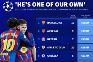 體育資訊1月20日訊 德國(guó)轉(zhuǎn)會(huì)市場(chǎng)統(tǒng)計(jì)了歐冠俱樂部之中自家青訓(xùn)球員的身價(jià),并列出榜單,巴薩居首,阿森納、拜仁前三。