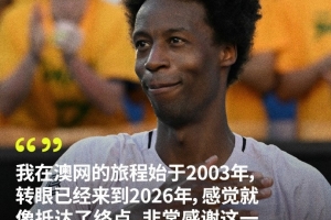 賽后,孟菲爾斯說道:“我在澳網(wǎng)的旅程始于2003年,轉(zhuǎn)眼已經(jīng)來到2026年,感覺就像抵達(dá)了終點(diǎn)。非常感謝這一路精彩的旅程,太不可思議了。”