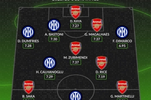 前鋒:薩卡(阿森納,7.26分)、勞塔羅(國(guó)際米蘭,7.67分)、馬丁內(nèi)利(阿森納,7.79分)