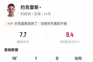 體育資訊1月21日訊 歐冠聯(lián)賽階段第7輪,阿森納客場3-1戰(zhàn)勝國際米蘭。約克雷斯替補出戰(zhàn),2次射門1次射正打進1粒進球,評分7.7。