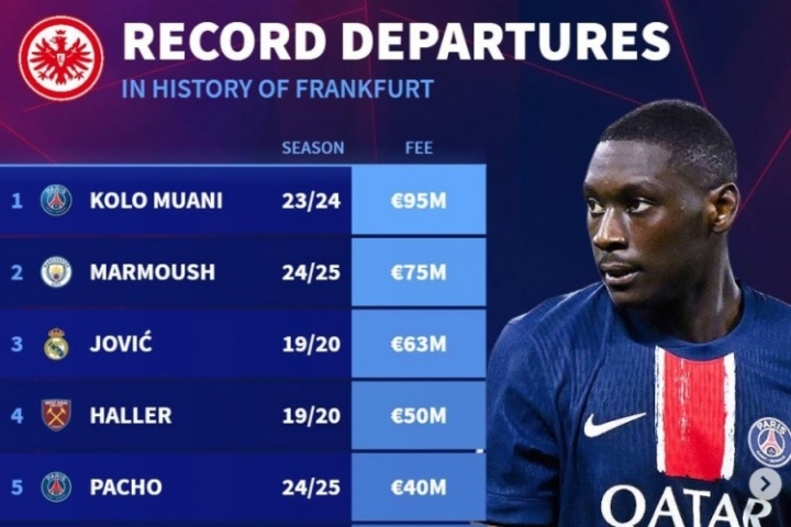 如果這筆轉(zhuǎn)會(huì)按照目前的進(jìn)展順利完成,?;倏擞型蔀榉ㄌm克福隊(duì)史轉(zhuǎn)出標(biāo)王,超越9500萬(wàn)歐的穆阿尼。