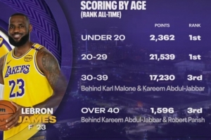 詹姆斯各個(gè)年齡段得分排名: