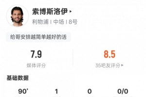 體育資訊1月22日訊 歐冠聯(lián)賽階段第7輪,利物浦3-0戰(zhàn)勝馬賽。索博斯洛伊首發(fā)出戰(zhàn),打進1粒進球,送出1次關(guān)鍵傳球,還有3次解圍,評分7.9。