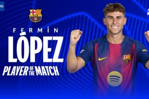 體育資訊1月22日訊 歐冠聯(lián)賽階段第7輪,巴塞羅那客場(chǎng)4-2戰(zhàn)勝布拉格斯拉維亞,賽后,費(fèi)爾明被評(píng)為全場(chǎng)最佳球員。
