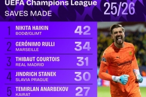 體育資訊1月23日訊 數(shù)據(jù)機(jī)構(gòu)Squawka統(tǒng)計(jì)本賽季歐冠門將撲救次數(shù),博德閃耀門將尼基塔·哈伊金以42次居首。
