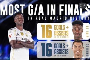 體育資訊01月23日訊 維尼修斯更新社媒,曬出自己在皇馬隊史決賽進(jìn)球+助攻數(shù)的排名,他本人以16個進(jìn)球+助攻與C羅、本澤馬和普斯卡什并列榜首!