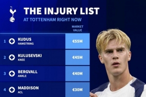 熱刺傷員德轉(zhuǎn)身價(jià)榜(總價(jià)2.55億歐):