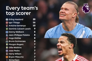 體育資訊1月24日訊 英超官方列本賽季各隊聯(lián)賽射手王,曼城哈蘭德、切爾西若昂·佩德羅、曼聯(lián)姆伯莫、阿森納約克雷斯+特羅薩德、利物浦?;倏?、熱刺里沙利松。