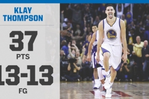 克萊在上半場不顯山露水,9投3中得到13分,但在第三節(jié)突然暴走,他單節(jié)打滿12分鐘,13投13中,其中三分9中9,罰球2中2,單節(jié)得到37分,創(chuàng)NBA歷史個人單節(jié)得分紀錄!