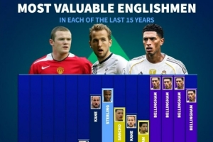 體育資訊1月24日訊 德轉(zhuǎn)盤點(diǎn)了近15年中,每一年身價(jià)最高的英格蘭球員,其中近五年身價(jià)最高均為貝林厄姆,具體如下: