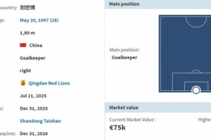 劉世博,1997年5月20日出生,曾效力于廣州隊(duì)。2023年,劉世博加盟山東泰山隊(duì)。2024賽季,劉世博代表泰山隊(duì)出戰(zhàn)6場。本賽季,劉世博沒有為泰山一線隊(duì)登場。