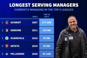 體育資訊7月21日訊 德轉統(tǒng)計了五大聯(lián)賽教練當前執(zhí)教時間數(shù)據(jù),德甲海登海姆主帥弗蘭克-施密特帶隊超17年居首,西蒙尼、瓜迪奧拉、阿爾特塔分列二三四位。