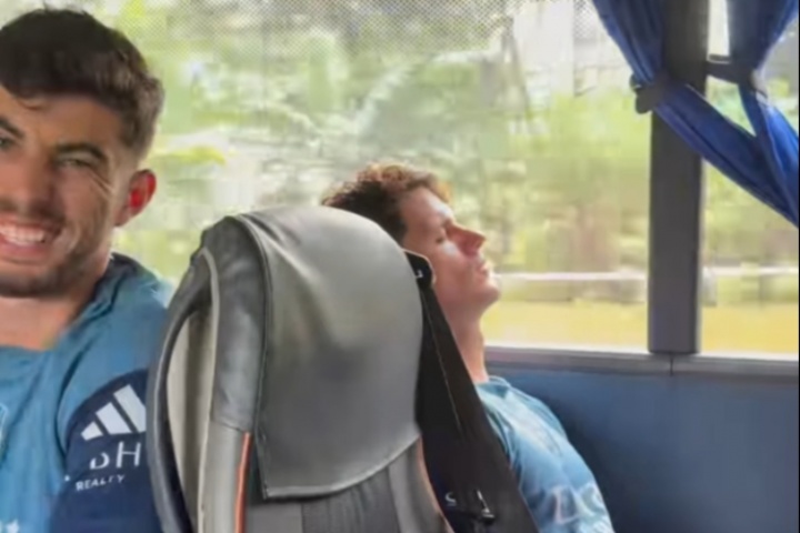 視頻中阿森納一眾小年輕在大巴上唱跳打鬧拍窗戶,31歲的新援諾爾高只覺得吵鬧,自己眉頭緊鎖閉目養(yǎng)神。
