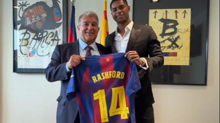 巴薩官推曬視頻,拉什福德與拉波爾塔一起手持巴薩14號球衣,配文:“我們的新14號????”。
