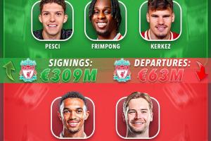 1-利物浦:轉(zhuǎn)會(huì)支出3.0868億歐,轉(zhuǎn)會(huì)收入6330萬歐,凈支出2.4538億歐